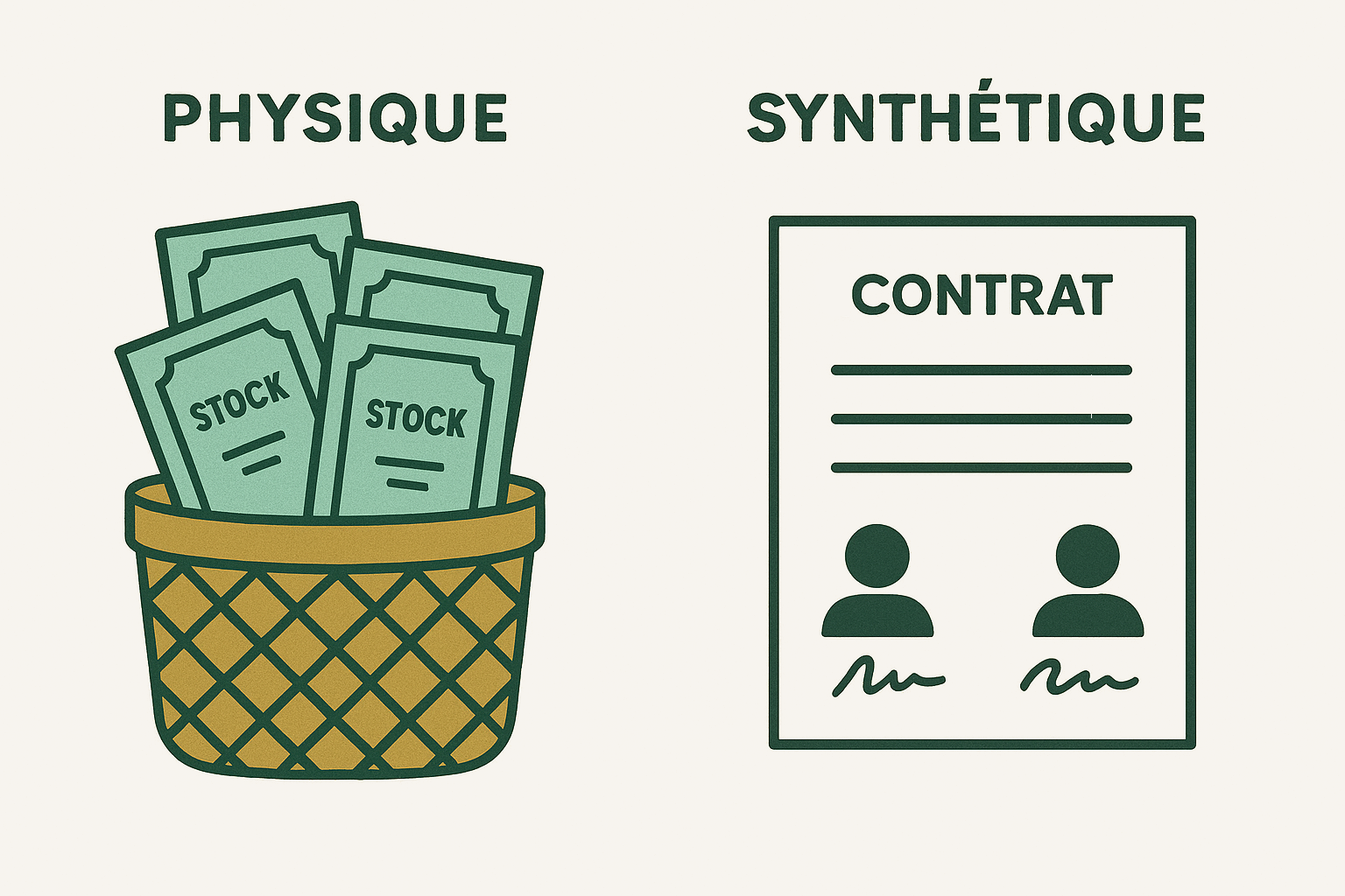 Réplication synthétique (swap) : le gestionnaire ne détient pas forcément les actions de l'indice cible. Il passe un contrat avec une banque qui lui garantit la performance de l'indice en échange d'une contrepartie. La réplication physique est absente, mais le résultat financier est identique.